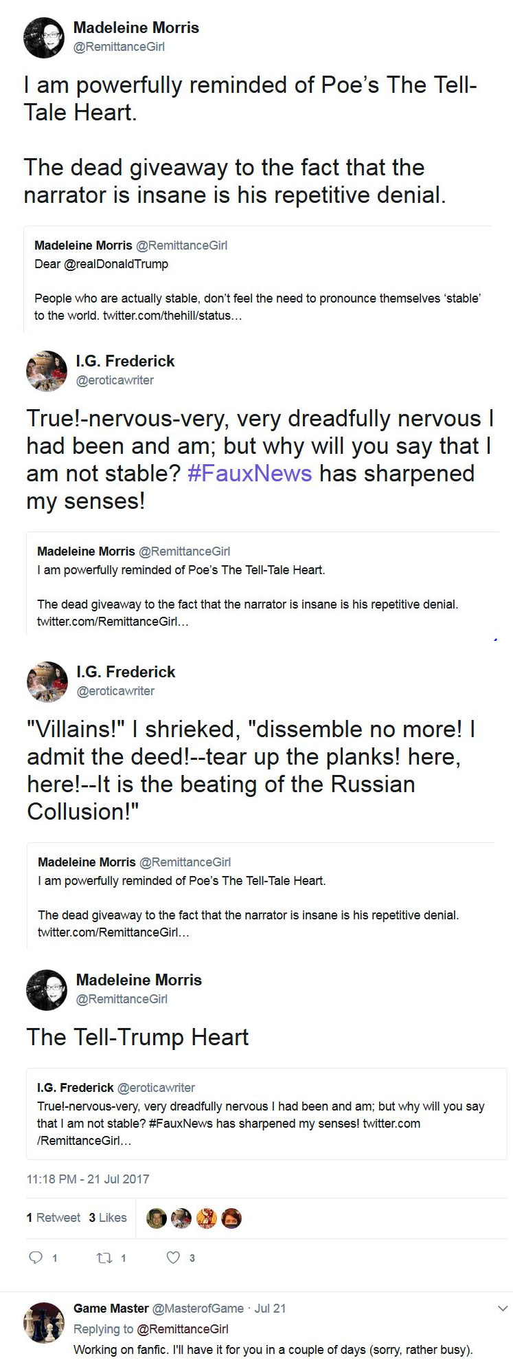 That resulted in an immediate request from Patrick to write the full fan fic version of The Tell-Tale Heart as The Tell-Trump Heart.