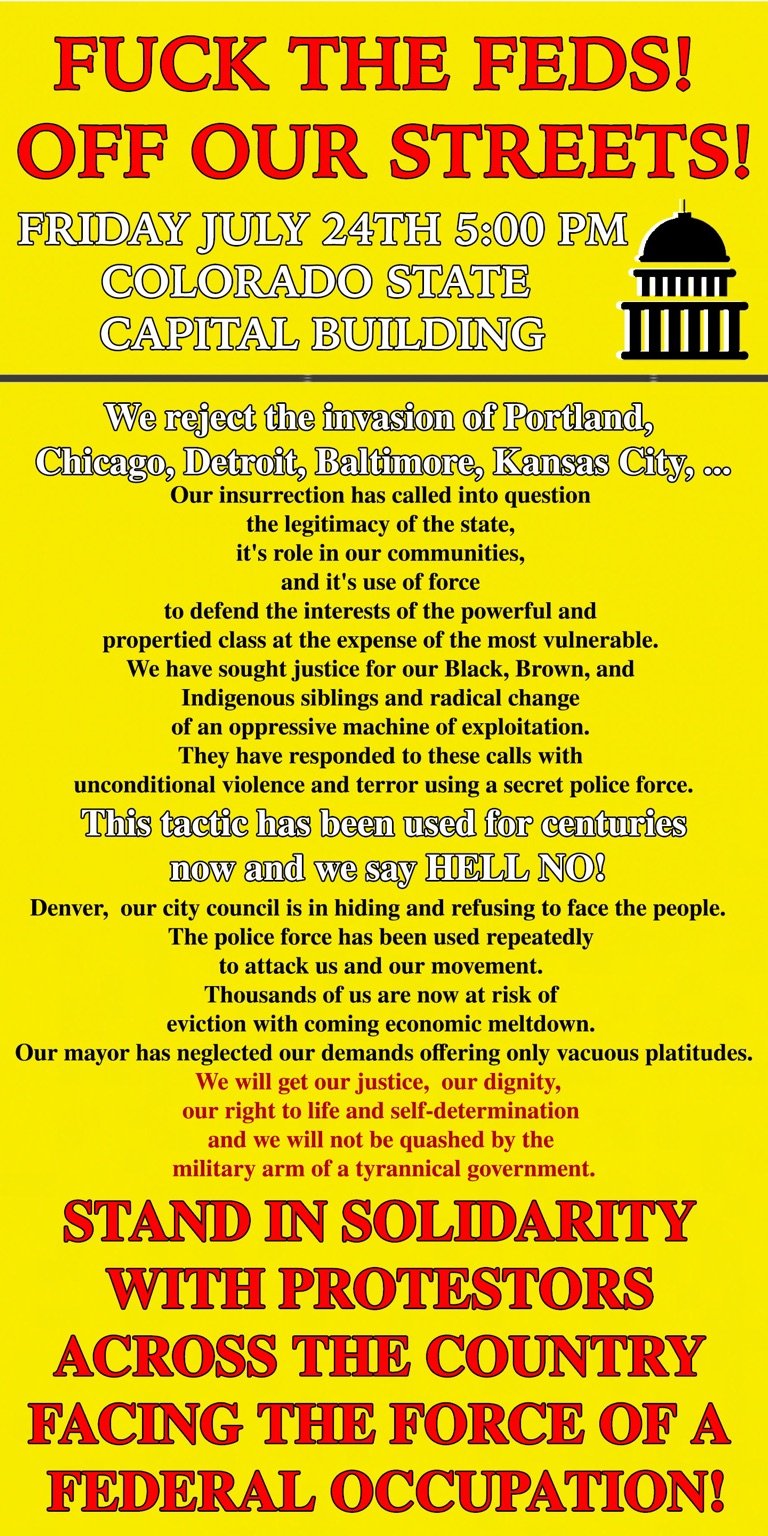 Friday July 24 and Saturday, July 25, people will be protesting across the country in solidarity against the federal invasion/occupation of Portland and the Fanta Fuhrer's promise to take his violent campaign road show to other cities. Look for an event in your town (PNW Youth Liberation Front is tracking/listing them) and go. Wear your mask. Study the safety protocols available online and abide by them. Do not bring your phone (it allows you to be tracked) or anything else you can't afford to have the police steal. Do not take photographs showing protesters faces, but do photograph the criminal activities of cops and feds.